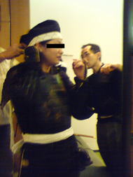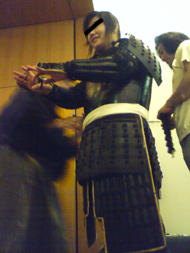 | だんだんと出来ていく甲冑。もうしゃがむことは出来ません(笑)着付けてくれる人が何やらかんやら言ってましたが、こっちも必死だったのでスルーしてました。 |