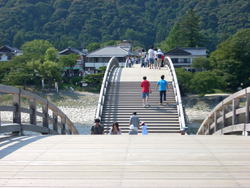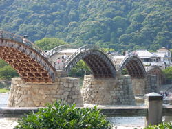 岩国駅から電車型レトロバス「いちすけ号」で錦帯橋へ。錦帯橋は釘を一本も使わない五連の橋です。右下の写真の中の左奥に佐々木小次郎縁の柳の木が見えます。 |