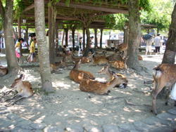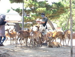 目ざとい鹿たち。袋を持って歩くとキケンです。 |